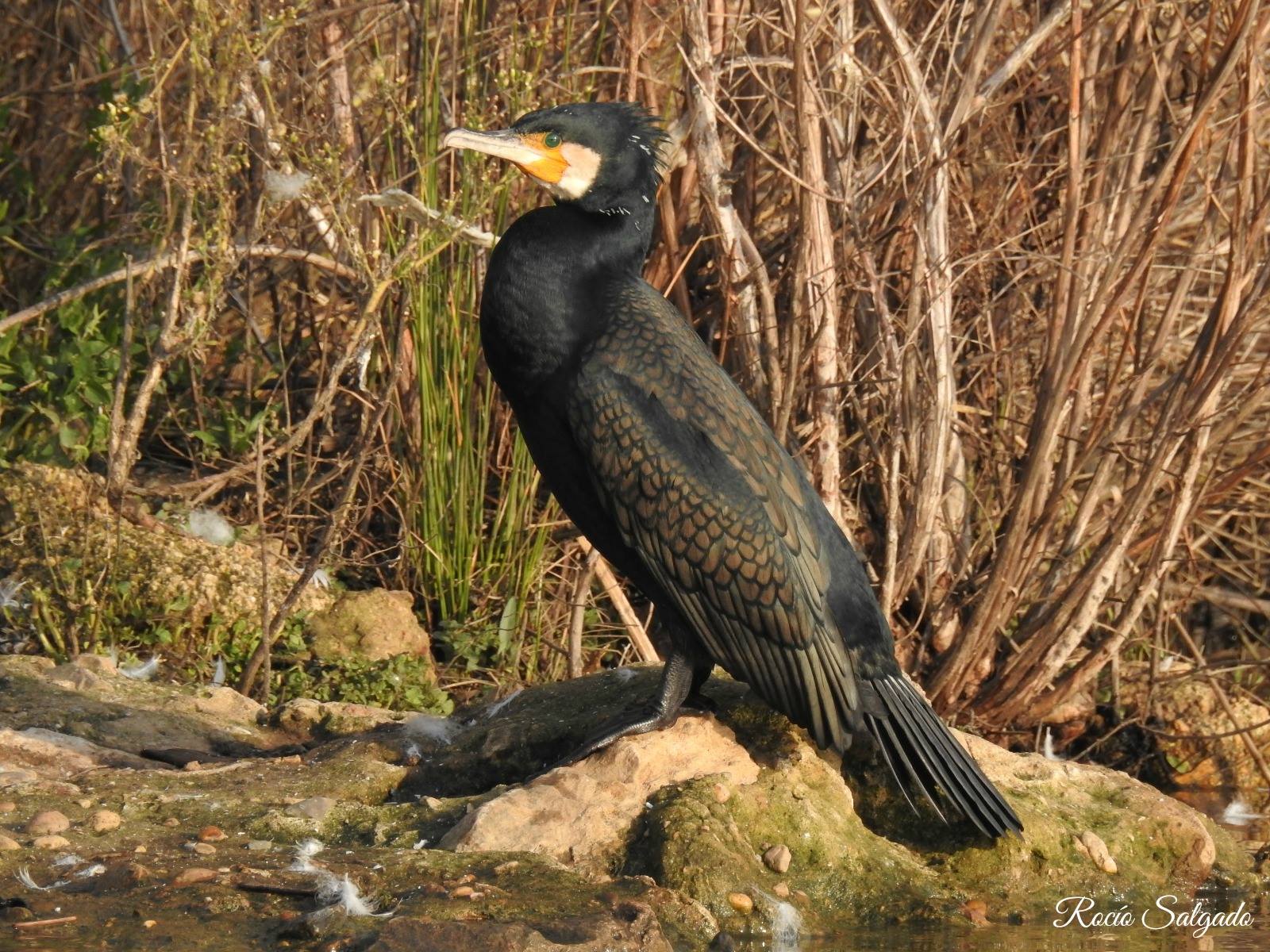 Cormorán grande tomando el sol en una de las rocas de la orilla del río Guadiana